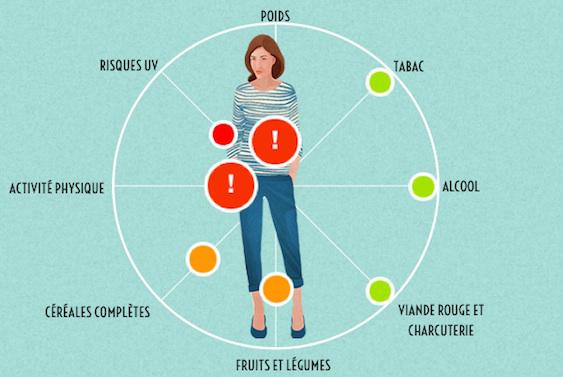 Présenté sous la forme d’un questionnaire, le test ludique s’intéresse à la consommation de tabac et d’alcool, aux habitudes alimentaires, à l’activité physique, à l’exposition au soleil, à l’âge, au poids, mais aussi aux risques liés au milieu professionnel. Il permet à chacun d'évaluer les facteurs de risque auxquels il est exposé, à travers son mode de vie et de ses comportements, et de pouvoir agir par la suite.