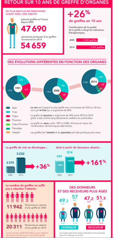 20 000 personnes sont actuellement en attente d’une greffe en France, tandis que seuls 5 500 ont pu être opérées l’an dernier, d’après l’association France Adot. Dans le cas du rein en particulier, parmi 14 336 candidats à une greffe rénale, seuls 3 074 ont été greffés en 2013, rappelle l’Agence de la biomédecine. C'est en 2012 que le seuil symbolique des 5 000 greffes par an a été passé, tirées en particulier par la franche augmentation des greffes de rein issus de donneurs vivants. Parmi les six organes que l'on sait greffer aujourd'hui, le rein est l'organe qui est le plus greffé, avec 60 % des greffes. À l'inverse, l'intestin représente moins de 1 %. Les personnes décédées sur lesquelles le prélèvement d'organes est possible ne représentent que moins de 1 % des décès qui surviennent à l'hôpital.