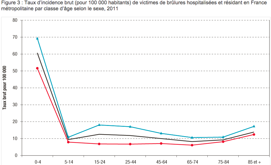 Enfin, l’incidence des victimes de brûlures n’est pas homogène sur l’ensemble du territoire français. L’Alsace, l’Aquitaine et l’Île-de-France avaient les taux d’incidence les plus faibles (entre 10 et 11/100 000). Le Nord-Pas-de-Calais, la Picardie et le Languedoc-Roussillon avaient, eux, les taux les plus élevés (entre 17 et 18/100 000).