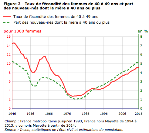 L'Insee explique que « la part des naissances de mères de 40 ans ou plus a commencé à diminuer avant 1940, puis le mouvement s’est accéléré jusqu’aux années 1980 ». Et sur le profil de ces mères, il faut noter que 26 % des naissances de mères de 40 ans ou plus, sont actuellement des premières naissances, 29 % des deuxièmes naissances et 44 % des troisièmes naissances ou plus. La proportion de premières naissances parmi les naissances tardives reste ainsi minoritaire, même si elle n’a cessé de progresser depuis une cinquantaine d’années. Elle était de 12 % en 1967, 17 % en 1981, puis 24 % en 2007.