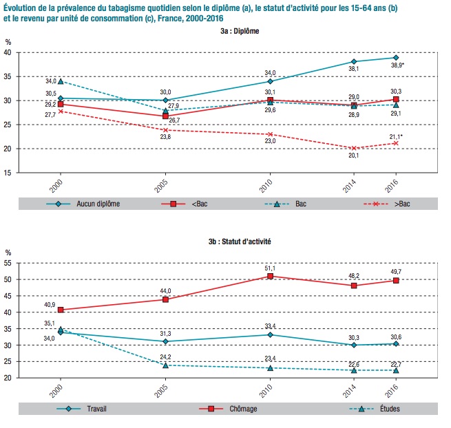 Par ailleurs, les baisses constatées ne semblent concerner qu’une partie de la population, la plus privilégiée. Entre 2010 et 2016, alors que la prévalence du tabagisme est passée de 23,5 % à 20,9 % parmi les personnes aux revenus de la tranche la plus haute, elle a augmenté de 35,2 % à 37,5 % chez les personnes aux revenus de la tranche la plus basse. Et atteint même 50 % chez les chômeurs. « Les écarts selon le niveau de diplôme suivent une tendance similaire, témoignant ainsi d’une augmentation des inégalités sociales en matière de tabagisme », notent les rapporteurs.