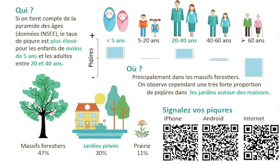 Cette plateforme mise au point par la Direction générale de la santé (DGS) et des chercheurs de l’Inra s’inscrit dans le projet de sciences participatives intitulé « Citicks ». Elle permet aux personnes piquées par une tique d’en informer les autorités et de décrire le lieu de l’attaque. Des informations qui permettront d’établir une cartographie précise des piqûres, et ainsi traquer les tiques.