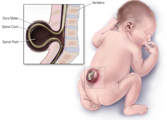 Le spina bifida est un défaut de fermeture de la partie arrière d’une ou plusieurs vertèbres, laissant à nu et sans protection le contenu de la colonne vertébrale (méninges, moelle épinière, racines nerveuses…). Une bosse se forme alors au bas du dos. La déficience en certains nutriments – en particulier l’acide folique (vitamine B9) et la méthionine – est une des raisons de la survenue de cette anomalie, dont l’origine reste pour grande partie mystérieuse. Les conséquences de cette exposition de la moelle épinière ou de ses annexes sont nombreuses. Le spina bifida peut provoquer :