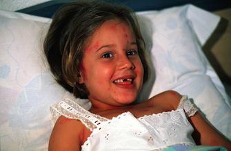 Les principaux symptômes sont entre autres une fièvre modérée, des maux de tête, une toux légère et le nez qui coule. Les lésions de la peau, typiques, apparaissent un peu plus tard : on observe de petites taches rouges sur le visage et le tronc, accompagnées de démangeaisons. Elles s’étendent à l’ensemble du corps et deviennent des petits boutons (vésicules) contenant un liquide clair extrêmement contagieux.
