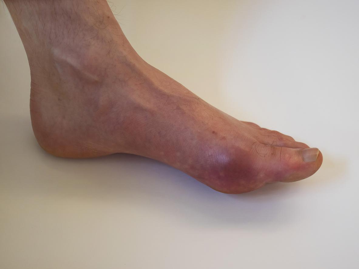 La goutte est une maladie chronique qui touche environ 0,9% de la population française, les hommes âgés étant les plus vulnérables. Elle est induite par une augmentation anormale du taux d’acide urique dans le sang et de dépôts de microcristaux d’acide urique dans les articulations et les tissus environnants, ce qui entraîne une inflammation. L’affliction se manifeste par des poussées que l’on appelle “crise de goutte”. Les malades ressentent alors des douleurs articulaires, qui s'accompagnent de rougeurs, d'un réchauffement et d'un gonflement de la région touchée. Généralement, chez les hommes, le gros orteil est le plus touché. Chez les femmes, d’autres articulations peuvent être mises à mal. Outre la douleur qu’elle entraîne, l’inflammation accrue les risques cardiovasculaires.