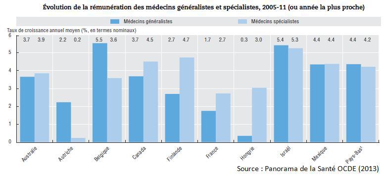 Les écarts de salaires se creusent entre médecins spécialistes et généralistes. La France en est un bon exemple : les généralistes ont un revenu qui s'accroît d'1,7% chaque année. Les spécialistes ont vu le leur tripler. Encore une fois, des extrêmes montrent que la France ne s'en tire pas trop mal. Chez les belges, les autrichiens et les hongrois, c'est le grand écart entre ces catégories.