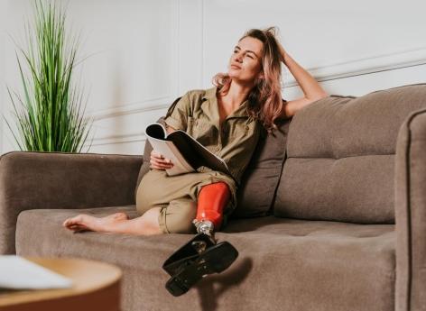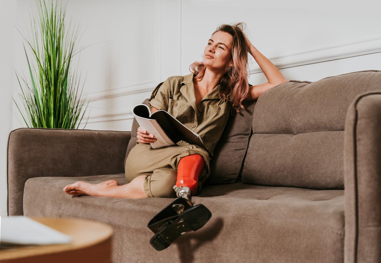 Les dispositifs, comme les prothèses, aident à se sentir bien dans sa peau. Dans mon cas, c’est une prothèse de jambe comportant une articulation du genou et de la cheville. Elle a joué un rôle important dans ma reconstruction physique, mentale et ma confiance en soi. Cet appareil permet de faire de nouveaux mouvements. En outre, le fait qu’il soit coloré ou pailleté donne envie de le montrer, comme si c’était un tatouage. En plus de pouvoir bien marcher avec cette prothèse, je peux changer de chaussures, même porter des talons. Cela m’incite à m’apprêter, porter des robes, me maquiller et donc sortir plus souvent. En tant que femme, ce sont des éléments importants.