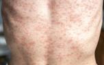 L’éruption cutanée caractéristique arrive de façon brutale au 15ème jour après la contagion, c’est « l’exanthème morbiliforme ». Elle commence derrière les oreilles et descend rapidement sur le visage et le tronc, puis sur le corps tout entier.