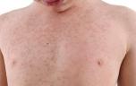 Les boutons sont des taches roses, bombées et irrégulières, « les maculo-papules », séparées par des intervalles de peau saine. Elles ne démangent pas et disparaissent en 5 à 6 jours.